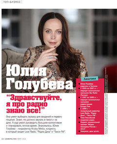 27.02.2014В мартовском номере журнала Cosmopolitan в рубрике «Топ-бизнес» опубликовано интервью генерального директора радиохолдинга Krutoy Media – Юлии Голубевой.